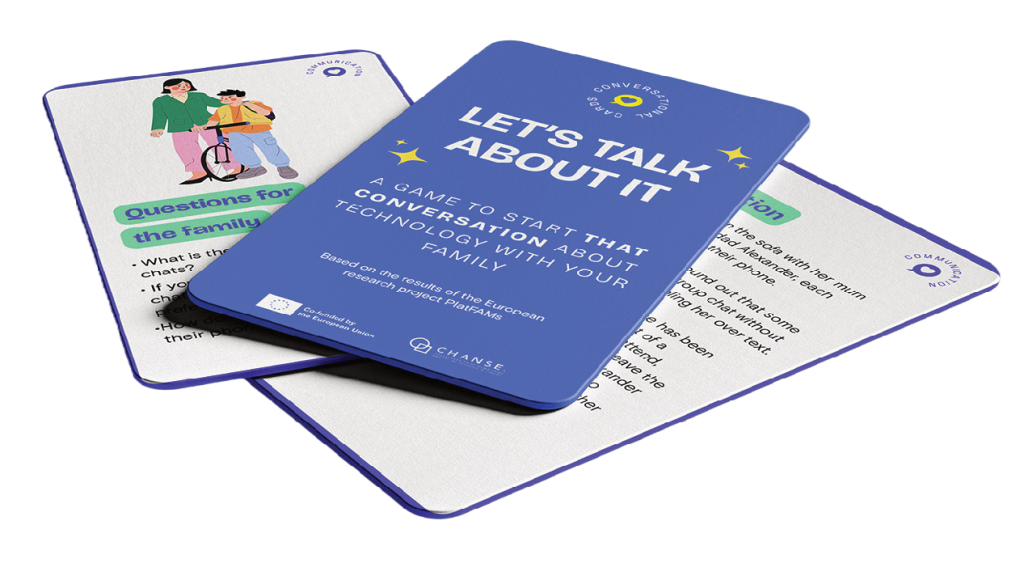 Based on the research findings, a conversational card game has been developed to facilitate knowledge transfer among families. The game aims to encourage families to discuss the topics we have identified as generating the most debates, dilemmas, or even disagreements in this area. The card game can be used to stimulate intergenerational dialogue at home or in community spaces (e.g., schools, libraries, or associations), facilitating guided conversations about everyday digital dilemmas.